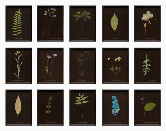 Pressed flowers on 15 urushi lacquered wood panel, framed