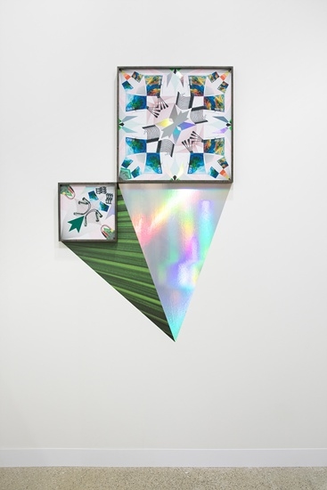 Acrylic polymer on metallic foil on bleached denim on inkjet print on canvas
