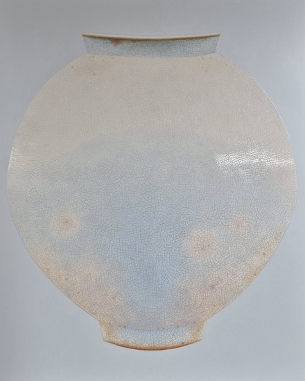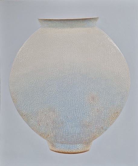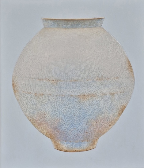 평면이라는 공간 안에서 달항아리. 밑색 위에 재료를 얹고, 그 재료가 마르며 갈라지는 시간을 기다리는 동안 인위적으로 통제할 수 없는 균열, 즉 ‘빙렬(氷裂)’. 작가의 오랜 시간 축적해 온 재료 실험과 빙렬 기법을 통해, 도자기 고유의 질감과 온도를 캔버스 위에 시각적으로 재해석하고자 한 시도에 주목할 필요가 있다.