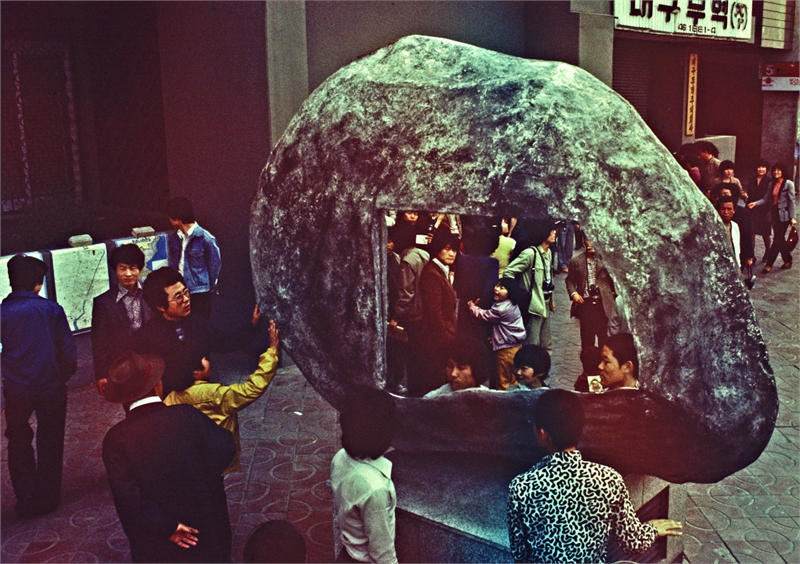 퍼레이드를 마친 인공 돌은 대구은행 근처의 길거리에 설치되었으며 행인들이 돌을 바라보거나 만져보는 장면이 실시간 녹화되어 세 번째 영상이 된다. (사진=갤러리현대)
