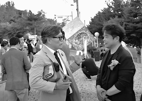 미술평론가 김진부와 작품에 대해 대화하고 있는 한호 작가 (사진= 한호아틀리에)