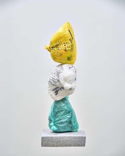 남다현 Nam Dahoon, Small Black Pink Mountain, 2025, trash in a garbage bag, styrofoam, 48 x 17 x 17 cm