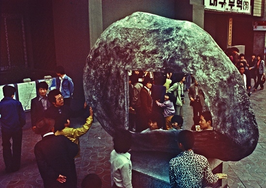 The project was originally staged as a large-scale performance traversing the streets of Daegu (a city in southeast Korea) on a 50-feet-long trailer truck for forty minutes, and exhibited as a combination of large artificial stones, video playback, photography, and installation at Maekhyang Gallery—the first hybrid media project in Korean art history which dismantled boundaries between the exhibition space and the urban environment outside. This ambitious exhibition, indexing a space and time that is dissonant from New York of the present, offers an alternate lineage of video art where technology is demystified and exists as one of many media embedded in the matrix of human perception and experience.