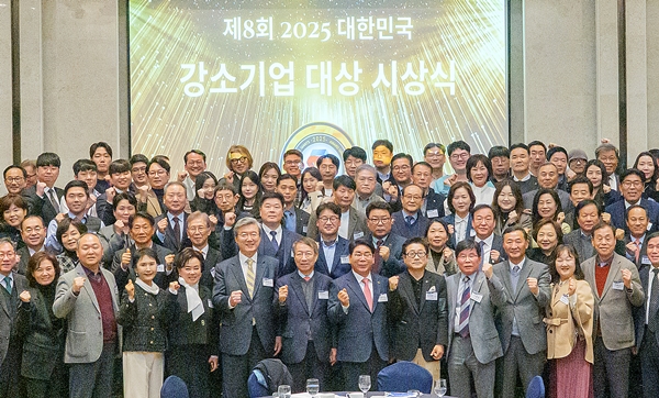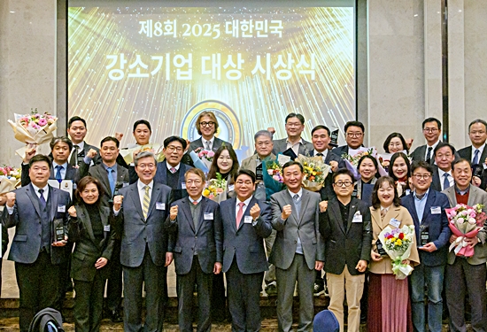 2025년 제8회 강소기업 대상 시상식에서 수상자 및 내빈들과 삼성로지피아(주) 유흥식 대표(가운데 둘째줄)가 기념 활영을 하고 있다. (사진= 한국강소기업협회)
