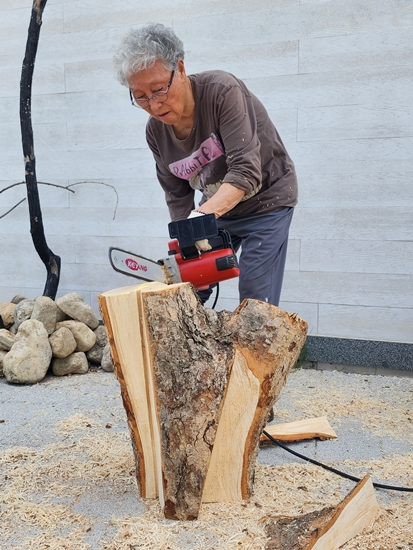 그가 선택한 재료는 나무다. 나무는 그에게 조형 재료 이전에 생명체이며, 시간의 축적이다. 특히 1984년 아르헨티나로 이주한 후 만난 남미의 나무는 그의 작업을 근본적으로 변화시켰다. 돌처럼 단단하고 무거운 그 나무들은 인간의 힘을 쉽게 허락하지 않는다. 전기톱을 밀어 넣는 순간, 작가의 몸과 나무의 저항이 정면으로 충돌한다. 김윤신은 이 충돌의 순간을 조각의 핵심으로 여긴다. 자르는 행위는 파괴가 아니라, 서로 다른 힘이 부딪히며 하나의 형태로 수렴되는 과정이다.