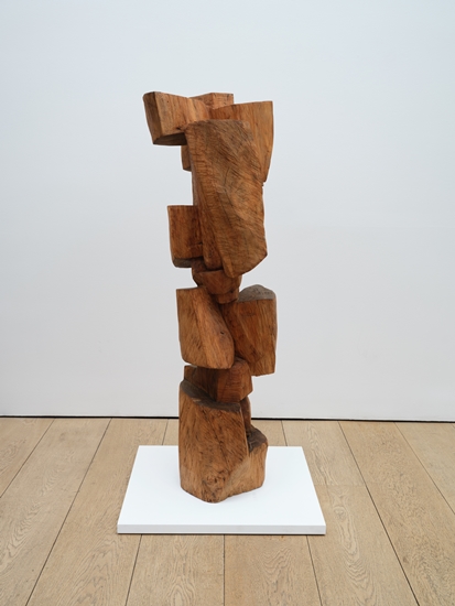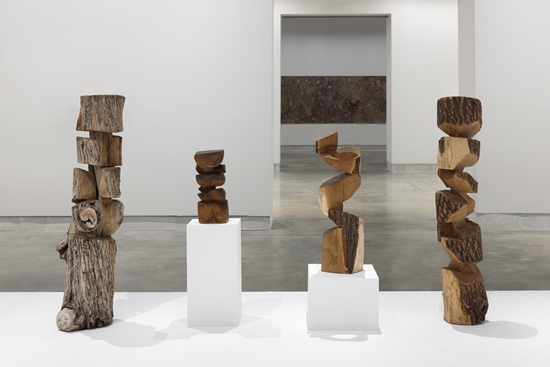 수직으로 축적된 「기원 쌓기」 연작은 돌탑과 토템폴처럼, 인간의 염원과 초월적 지향을 시각화한다. 하늘을 향해 곧게 선 이 조각들은 단순한 형태를 넘어, 기도의 구조를 품는다. 작가는 이를 “하늘을 향한 염원”이라고 말한 바 있다. 그러나 이 기도는 초월적 존재를 향한 호소라기보다, 인간과 자연이 다시 하나로 연결되기를 바라는 몸의 언어에 가깝다. 하늘과 땅, 인간과 자연을 가르지 않는 사유가 바로 여기서 조형적 언어로 구현된다.