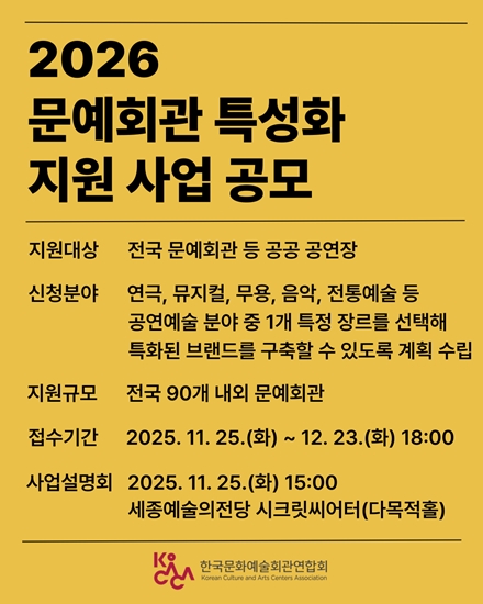 문화체육관광부(장관 최휘영)와 한국문화예술회관연합회(이하 코카카)는 지역 문예회관의 기획・제작 역량을 강화하고 지역 문화예술 활성화 기반을 마련하기 위해 ‘2026년 문예회관 특성화 지원 사업’을 대폭 확대・개편해 공모사업을 진행한다고 밝혔다. 2026년 사업 공모 접수는 11월 25일부터 12월 23일까지다.예산은 4배