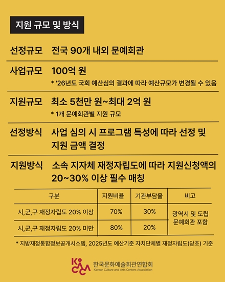 2026년 사업은 전년도보다 지원 규모가 어마어마하게 확대된다. 예산은 2026년 정부안 기준으로 기존 25억 원에서 100억 원으로 4배 증액되며, 선정 문예회관 수 역시 18개에서 90개 내외로 5배가량 늘어난다. 이는 전국 문예회관이 지역 공연예술 창작과 제작의 거점으로 기능하며 지속 가능한 창작 환경을 마련할 수 있도록 하는 데 중점을 두고 있다.