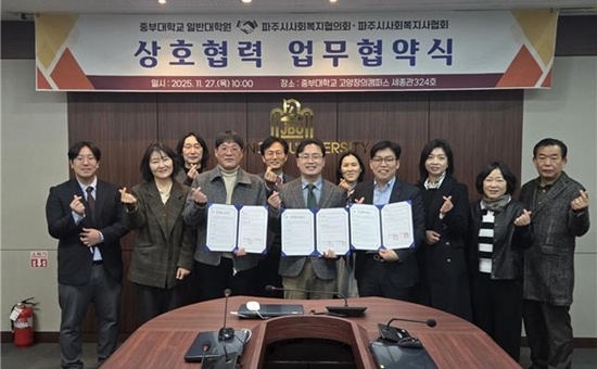 중부대학교(총장 이정열)는 본교의 일반대학원이 지난 11월 27일 파주시사회복지협의회, 파주시사회복지사협회와 사회복지 분야 발전을 위한 업무협약(MOU)을 체결했다고 밝혔다.
