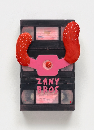황혜정_몸 두마리는 머리 하나보다 강하다_2025_VHS tape, leather, fur, acrylic, paper, resin_ 22 x 31 x 4cm (사진= 카라스갤러리)